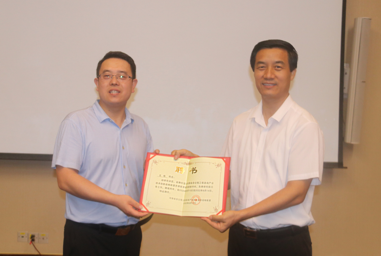 楊明宇理事長為濟(jì)源技術(shù)研究院秘書長王偉頒發(fā)聘書