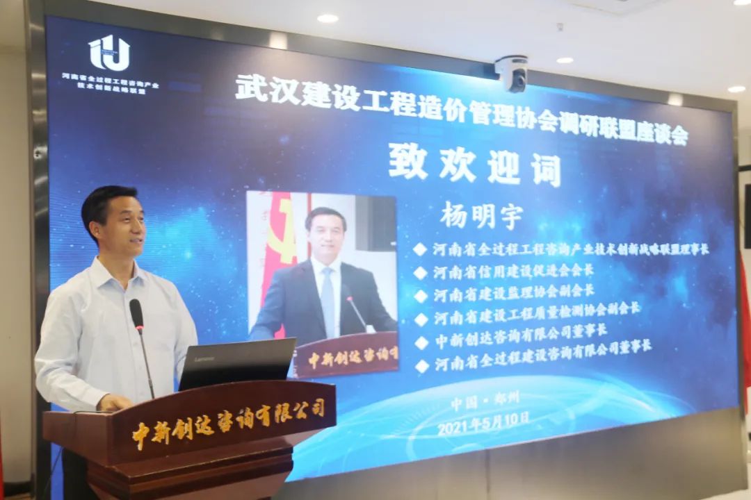 2021年5月10日下午,武漢建設(shè)工程造價(jià)協(xié)會(huì)顧問、湖北省造價(jià)協(xié)會(huì)副會(huì)長汪國剛,湖北省造價(jià)協(xié)會(huì)副會(huì)長、中德華建(北京)國際工程技術(shù)有限公司董事長汪建新,海天咨詢董事長韓江濤一行9人到聯(lián)盟調(diào)研交流。河南省全過程工程咨詢產(chǎn)業(yè)技術(shù)創(chuàng)新戰(zhàn)略聯(lián)盟理事長、中新創(chuàng)達(dá)咨詢有限公司董事長楊明字、中新創(chuàng)達(dá)咨詢有限公司執(zhí)行董事徐希萍、黨支部書記董高峰、河南省全過程工程咨詢產(chǎn)業(yè)技術(shù)創(chuàng)新戰(zhàn)略聯(lián)盟秘書長王偉及聯(lián)盟單位代表熱情接待并組織座談會(huì)。
