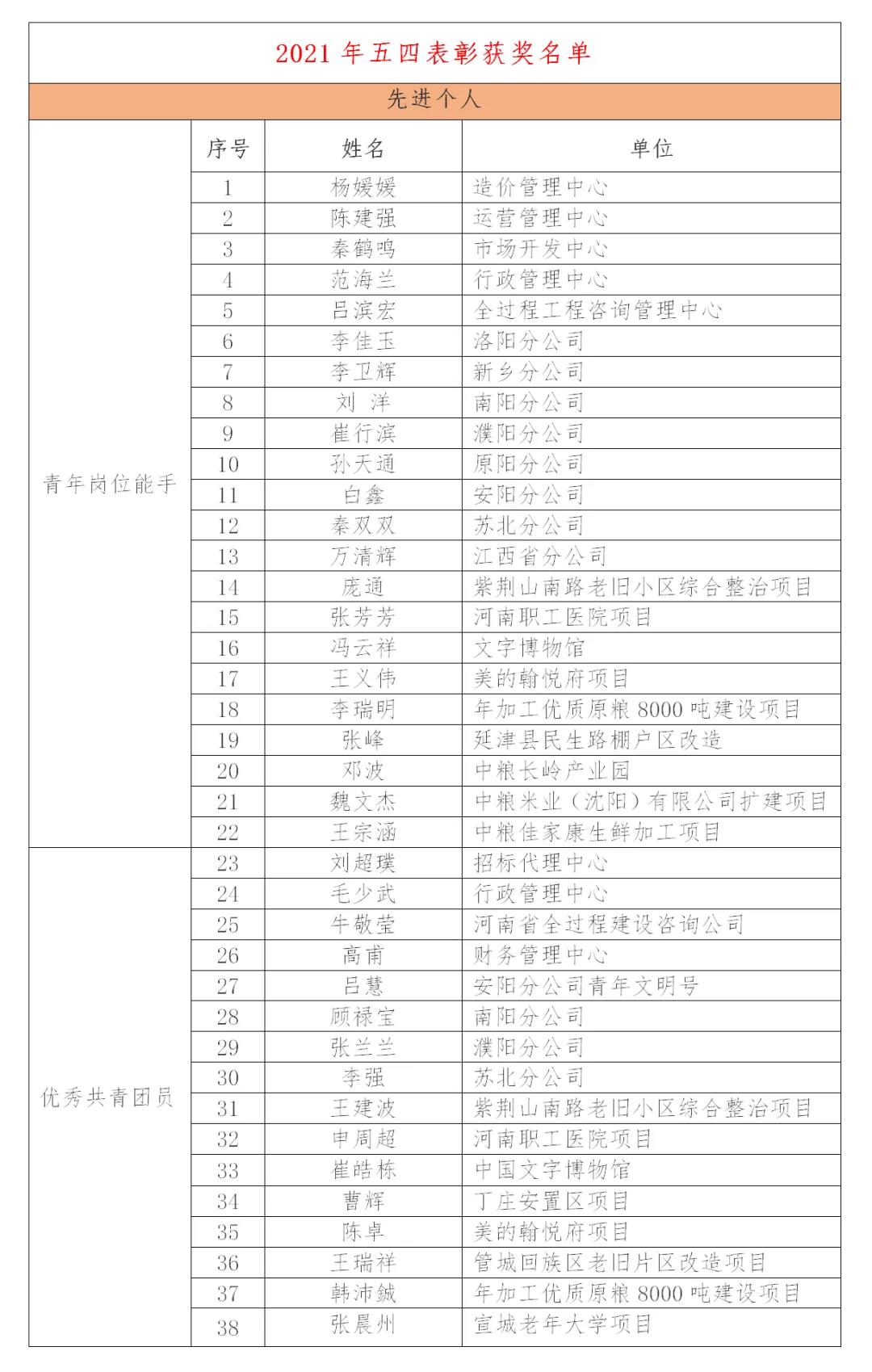 根據評選表彰辦法,在對候選對象進行初評、考察、復核的基礎上,經評委會審議,現對擬表彰個人(集體)進行公示。決定授予楊媛媛、崔行濱等22人為“青年崗位能手”、授予李勁、張尚新等20人為“匠心服務標兵”,授予申周超、呂慧等22人為“優秀共青團員”,授予嚴巍、平治中等5人為“青年創業標兵”;授予新鄉分公司、南陽分公司等為“創新創業先進集體”,授予濟源分公司、原陽分公司等為“志愿服務先進集體”,授予濮陽分公司、洛陽分公司等為“青年文明號”(詳細名單見附件)。